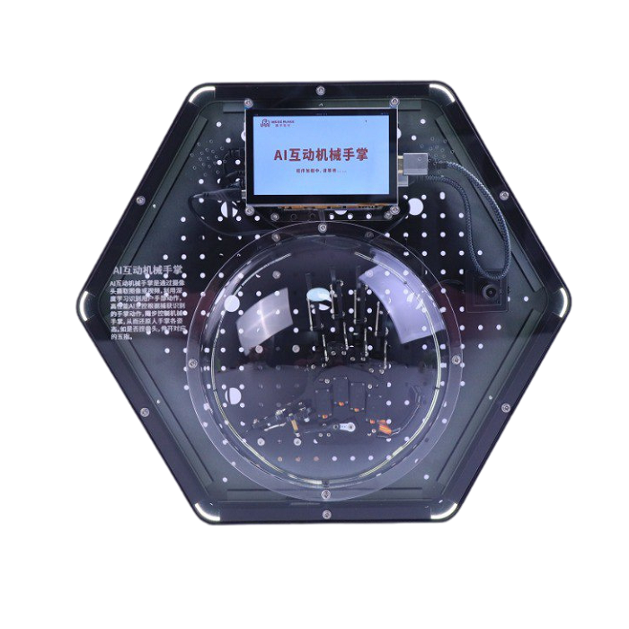 Интерактивный модуль для оформления зон рекреации, кабинетов, IT-полигона, библиотеки, медиа зоны. Модуль демонстрирует работу механической ладони с искусственным интеллектом. Используя камеру для распознавания изменений положения пальцев на ладони человека, механическая ладонь повторяет движения руки человека. Модуль выполнен в форме шестиугольной призмы с интерактивным наполнением.