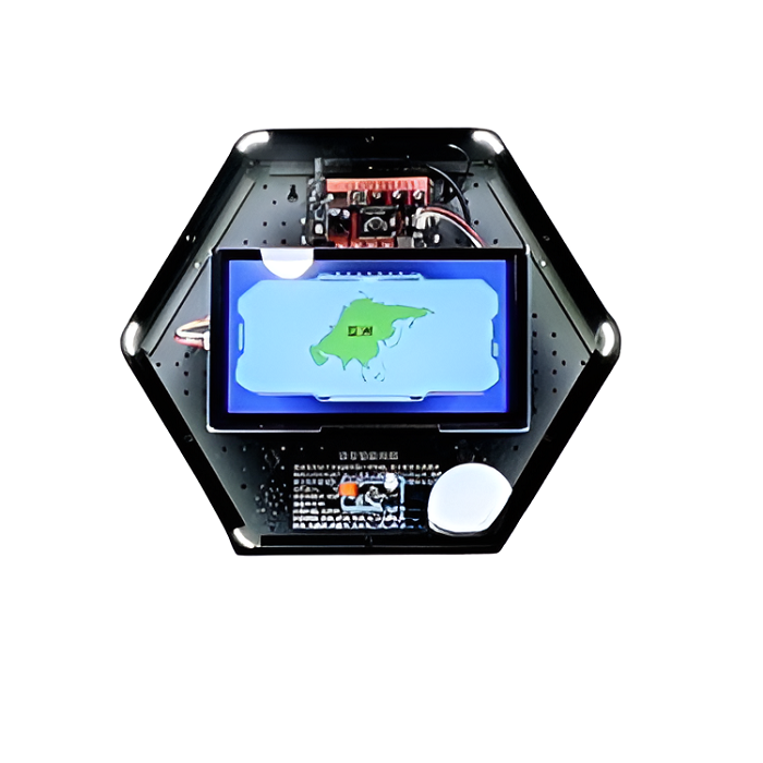Интерактивный модуль для оформления зон рекреации, кабинетов, IT-полигона, библиотеки, медиа зоны. Модуль сочетает в себе распознавание речи и географические знания, с целью создания метода изучения карты, основанного на голосовом взаимодействии. Модуль выполнен в форме шестиугольной призмы с интерактивным наполнением.