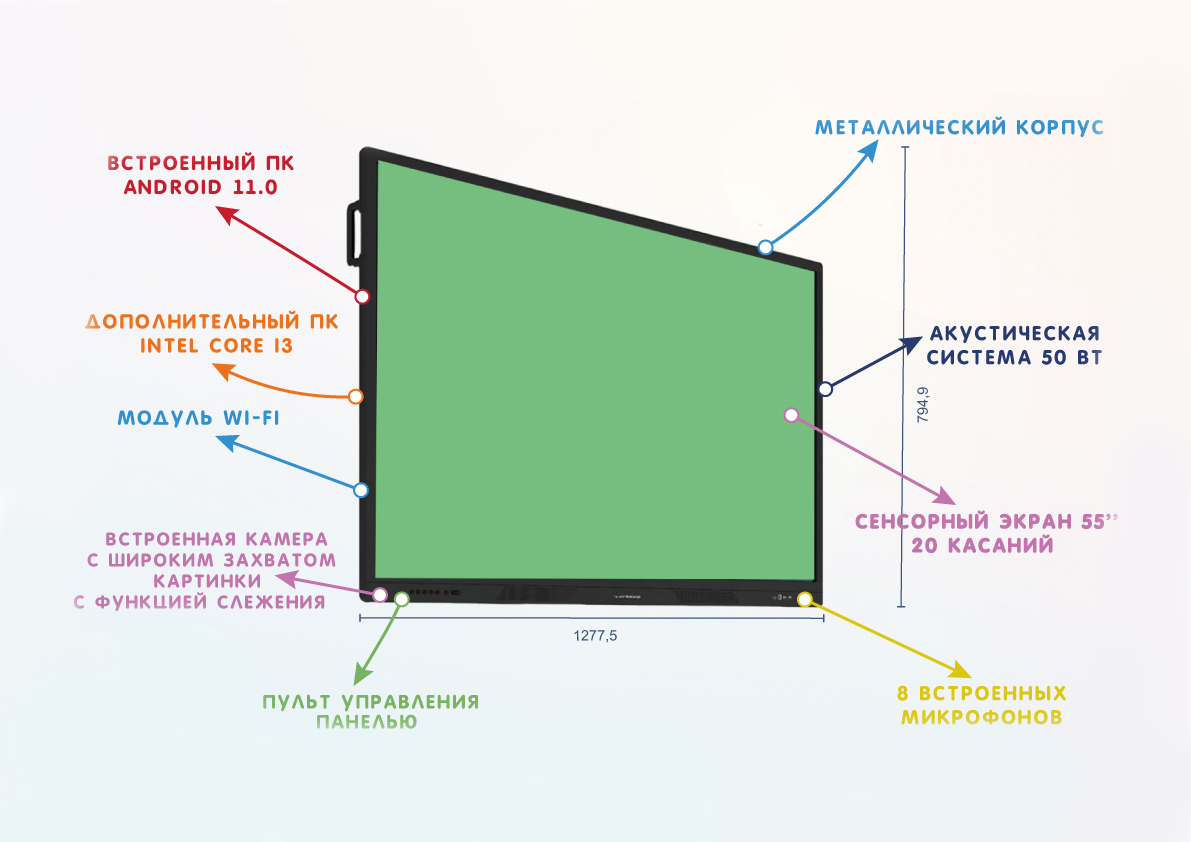 Smart SchoolBoard 55 – это сенсорная панель высокого разрешения в тонкой металлической рамке. Благодаря четкому и яркому изображению все демонстрируемые материалы хорошо видны из каждого уголка класса или аудитории.