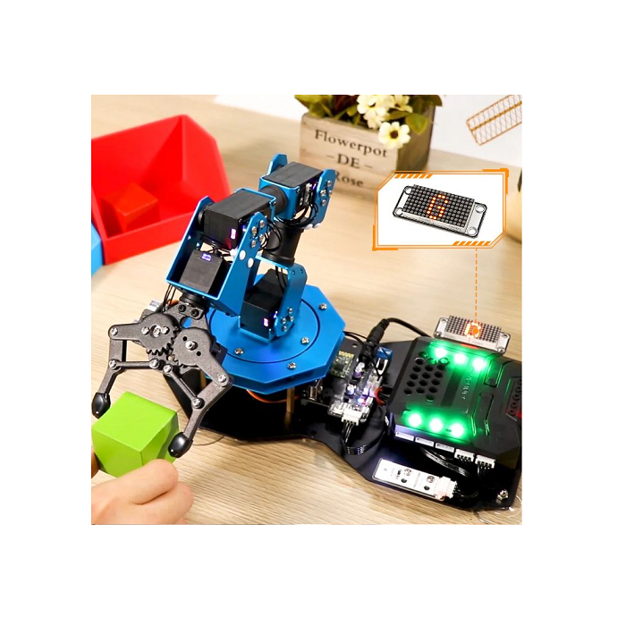 Расширенный комплект роботизированного манипулятора предназначен для углубленного изучения мехатроники, механики, физики и манипуляционных действий. Имеет три варианта программирования Scratch, Python и непосредственное управление моторами. Подходит для школы, техникумов и вузов. Функция распознавания цвета и расстояния. Различные варианты управления – ручное управление, джойстик, управление с помощью ПК, управление с телефона. Программирование осуществляется с помощью компьютера, телефона или в ручном режиме (без дополнительных устройств).