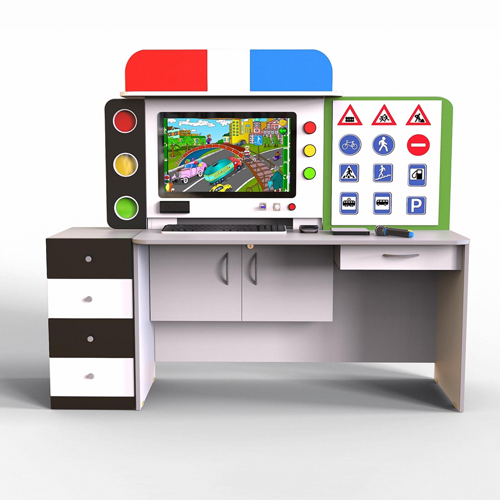 Модель изготовлена в виде корпусной мебели (рабочего стола с ящичками, отсеками) из ЛДСП. Наличие ящиков, подразумевает размещение методических или дидактических материалов. Интерактивная система размещена на рабочем месте ученика и со соответствующим дизайном, привлекающим внимание ребенка, вовлекающим его в обучающий процесс.