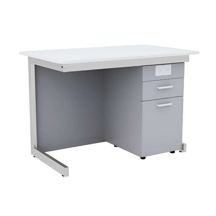Стол преподавателя для кабинета физики/химии/биологии выполнен из металлического корпуса, со встроенной тумбой. Размер столешницы 1200*750*750. Столешница изготовлена из ДСП, покрытие химически стойкий пластик толщиной 0,8мм. В столу подведено электричество и установлены розетки.