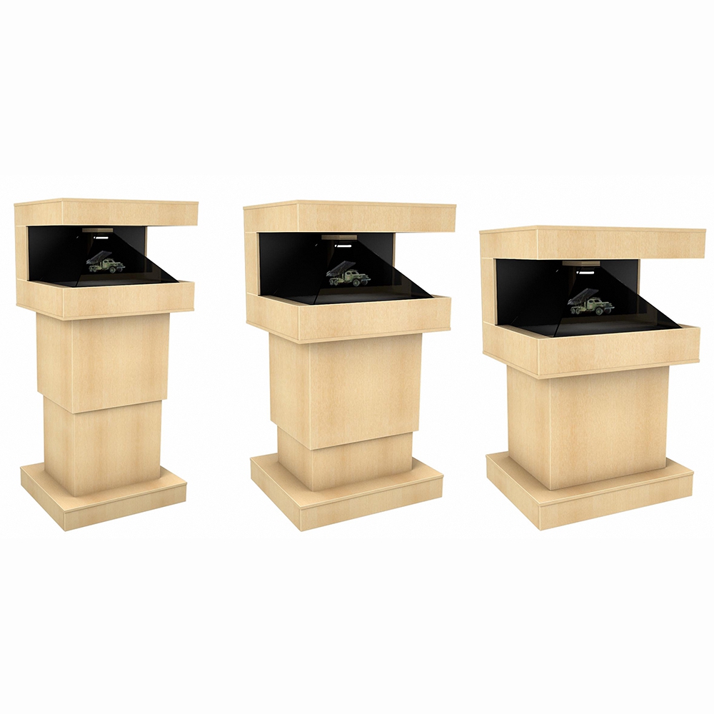 Устройство представляет собой оборудование, которое способно демонстрировать выбранный объект в 3Д пространстве в виде голограммы, не используя 3D очки. Выполнена пирамида из безопасного материала ЛДСП.