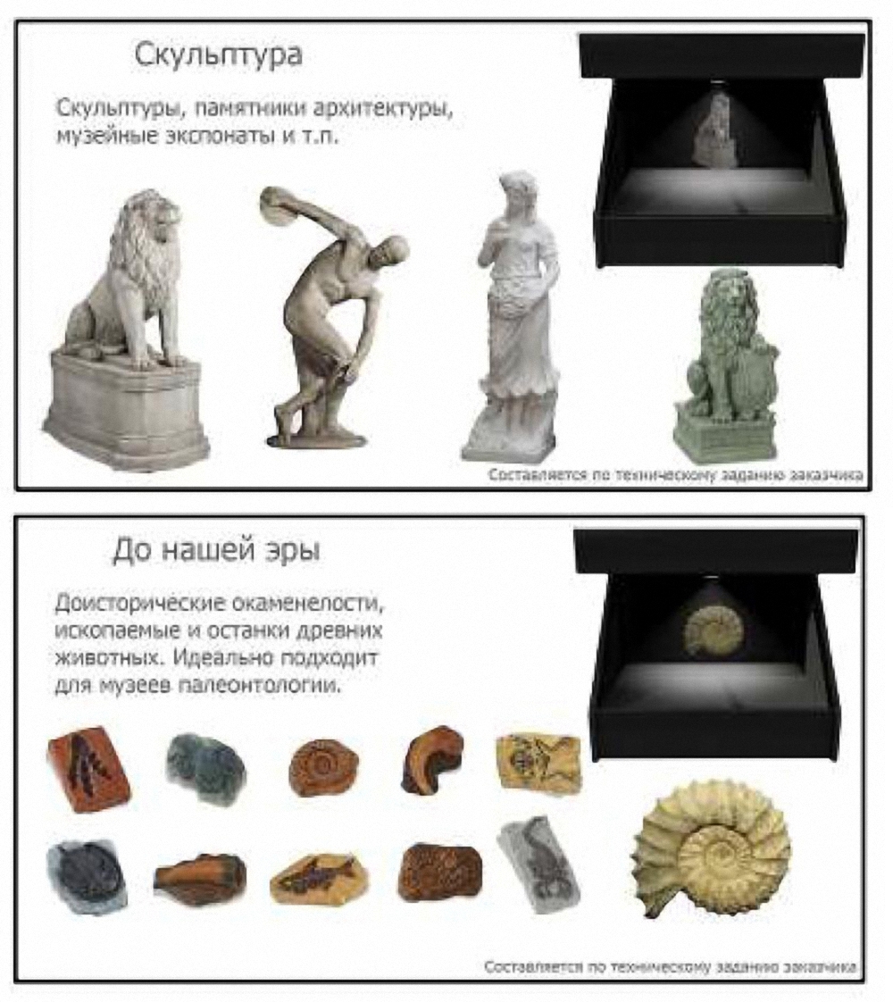 В качестве объектов для демонстрации могут выступать совершенно разные экспонаты: оружие, автомобили, украшение, животные, техника, логотип организации, скульптуры и рекламные видеоролики. Качество изображения Full HD. По желанию, презентация сопровождается текстовой или звуковой информацией.