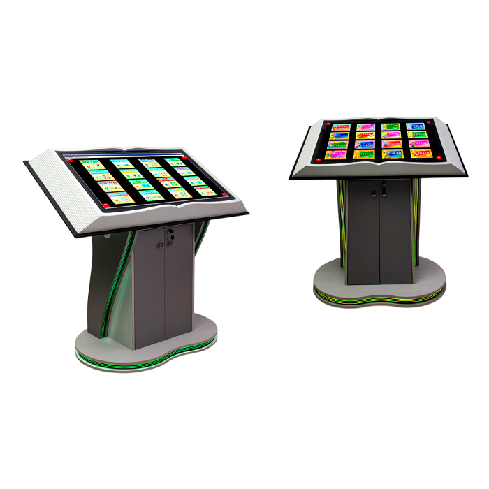 Интерактивная книга является единой мультимедийной сенсорной системой в стилизованном корпусе. Верхняя часть интерактивной книги представляет собой антивандальный сенсорный монитор, заключенный в декоративный корпус, выполненный в виде развернутой книги.  Нижняя часть сенсорной книги представляет собой стойку со светодиодными декоративными вставками. Интерактивный монитор расположен под оптимальным углом для удобства пользователя.