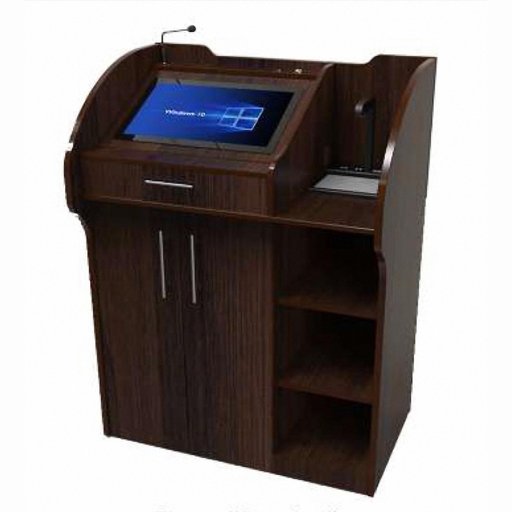 Разработчики уделили внимание комфорту управления процессом доклада. Функции выведены на сенсорный экран, где происходит управление мультимедийными материалами. Также в тумбу встроены функциональные отделы для документов, полочки для личных вещей.