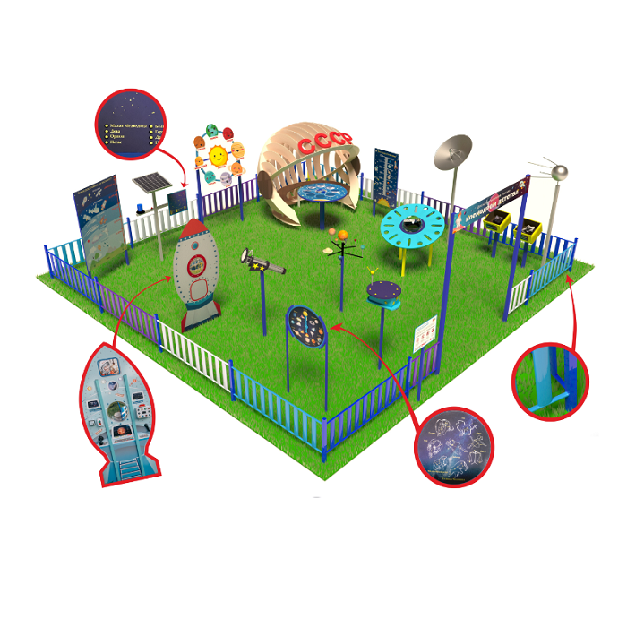 «Детская космическая станция» - это уличный комплекс, в состав которого входят красочные интерактивные стенды и макеты. С их помощью дети осваивают первые азы астрономии.