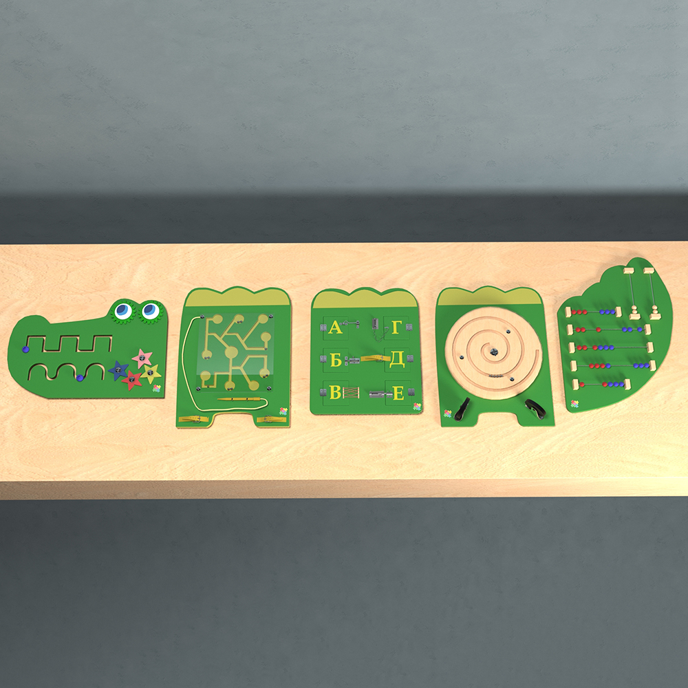 Это многосоставной настенный бизиборд, которая состоит из нескольких модулей; у каждого из которых есть своё место в общей картинке. Она будет интересна и увлечет в игру детей разных возрастов. Форма и изображение крокодила познакомит ребенка с миром животных. Бизиборд зеленого цвета благоприятно влияет на детей, цвет сводит к минимуму негативные эмоции, полученные в течение дня, и после игры малыш будет спокойно спать. Бизиборд «Крокодил Гена» обязательно стоить купить, ведь игра заменит множество игрушек. Бизиборд можно приобрести для дома, для дошкольных учреждений, медицинских клиник и для развивающих центров.