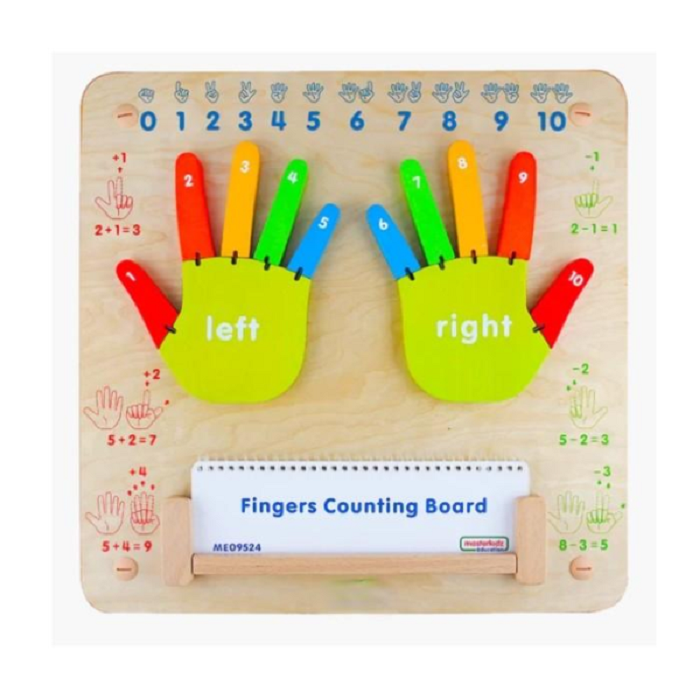 Использование своих собственных пальцев, это первое чему учатся дети, начиная считать. С помощью панели для подсчета пальцев, они могут наблюдать сходство между своими руками и руками и пальцами на панели. У каждого пальца есть шарнир, поэтому его можно "загнуть" во время пдсчета. Цвета и метки помогают лучше визуализировать лево и право и усиливают связь между цифрами и количеством. Так же можно выполнить простое сложение и вычитание.