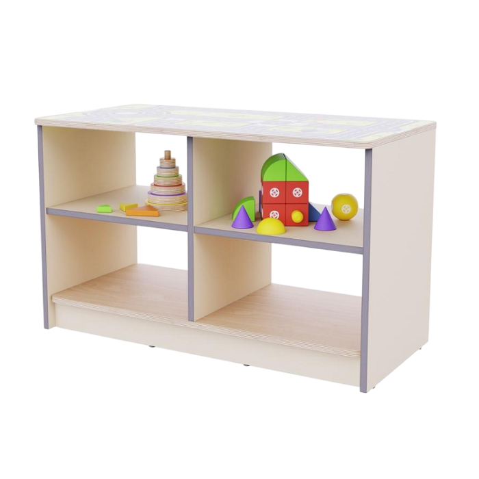 Функциональная и универсальная система хранения включает полки и открытое пространство для удобного и безопасного размещения развивающих игр и игрушек. Ребенок в любой момент сможет взять то, что ему нужно. На верхней поверхности цветная печать с картами дорог и настольной игрой, дети могут использовать ее для своих активностей.