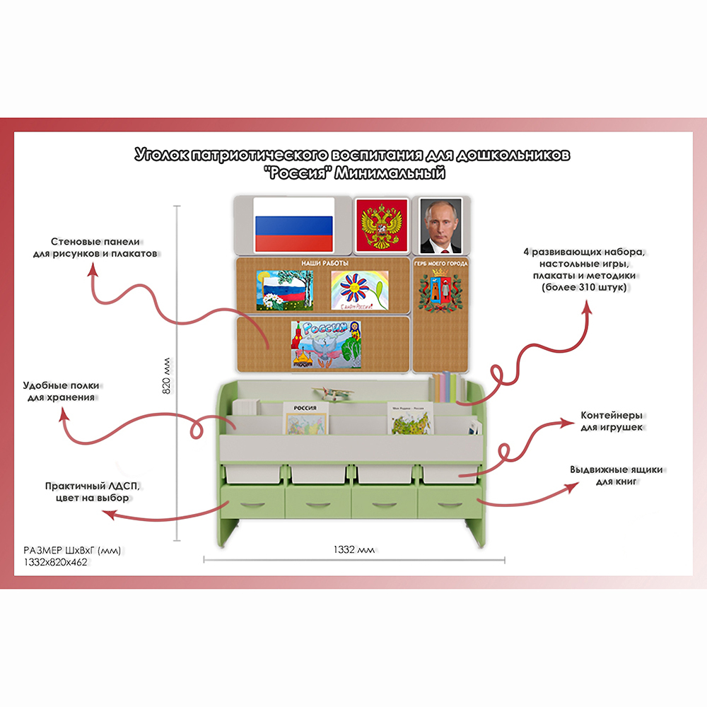 Уголок патриотического воспитания для дошкольников AVK "Россия" Минимальный - подходит для проведения уроков патриотического воспитания в детских садах и других дошкольных учреждениях. На занятиях ребенок знакомится с традициями и историей своей страны. Книги и упражнения в игровой форме делают процесс обучения более интересным.