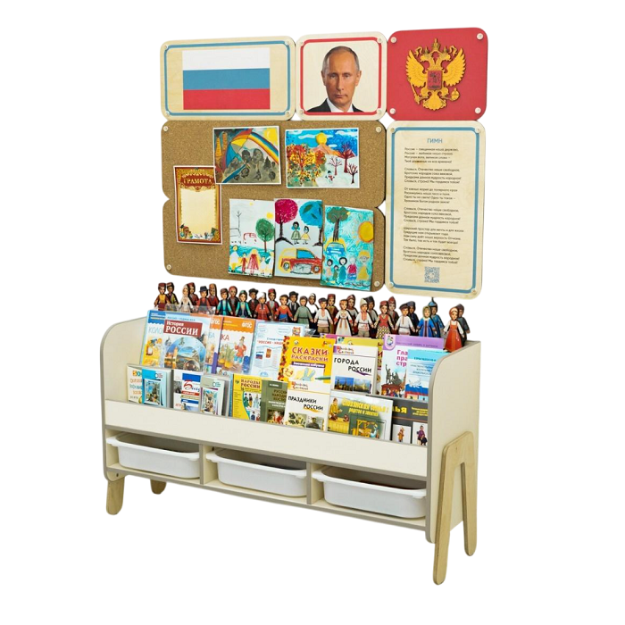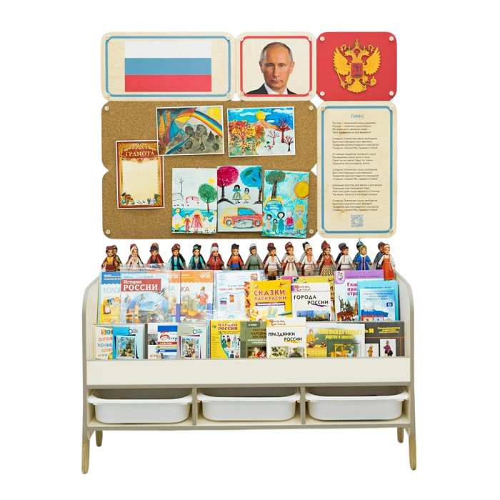В комплекте собраны книги, раскраски и настольные игры для создания полноценного курса по патриотическому воспитанию. Удобные стеллажи с полками и ящиками содержат всё необходимое наполнение, чтобы проводить занятия с дошкольниками 3-6 лет.