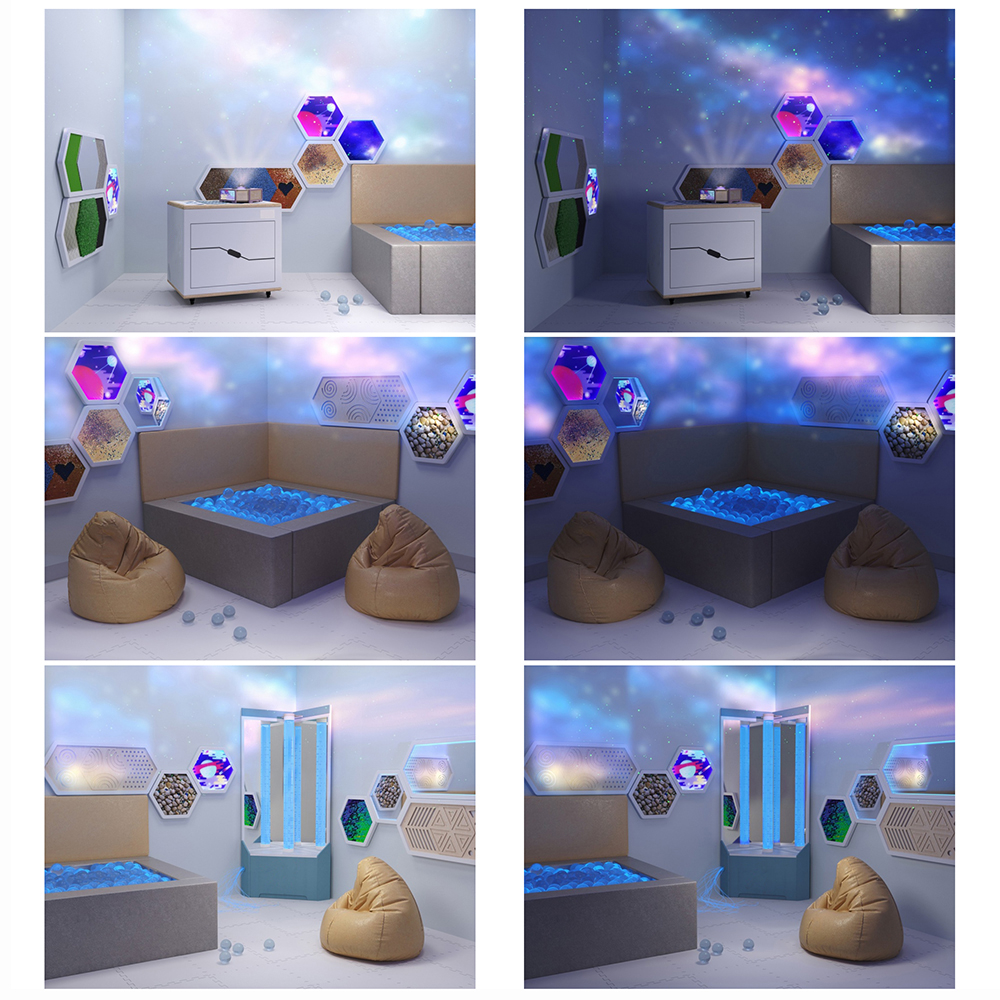 Проектор звёздного неба «Галактон» также служит для расслабления, ощущения покоя и безопасности. Он погружает комнату в атмосферу летней ночи с волшебным сиянием созвездий и тихой умиротворяющей музыкой. В нём есть 10 режимов, таймер отключения и возможность добавлять любое музыкальное сопровождение.
