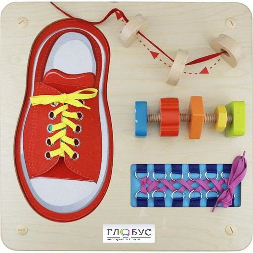 Панель выполнена из березовой фанеры. На лицевой поверхности панели выполнено углубление, в котором зафиксирован макет обуви со шнурком для изучения различных методов шнуровки. В верхней правой части расположены выступы в форме полукруга в кол-ве 3 шт.,  ниже на выступах расположен шкив с резьбой, на котором перемещаются 3 фигуры разных форм. В нижнем правом углу расположено углубление, в котором вмонтированы металлические кольца в кол-ве 12 штук, через которые продевается шнурок для изучения различных методов шнуровки.