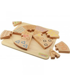 На панели представлен круг, состоящий из сегментов, каждый из которых имеет свою текстуру и свой рисунок. Каждый сегмент поделен на 2 части, имеющие общую текстуру и общий рисунок. С помощью данного пособия можно придумать множество игр на тактильное и визуальное соответствие.